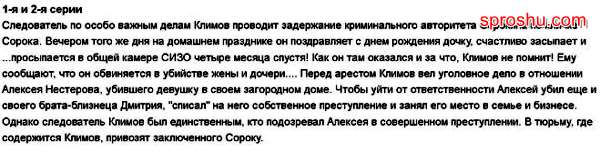 А вот так там изложено содержание - завязка всего сюжета, первые две серии детектива с Дмитрием Паламарчуком в главной роли -
