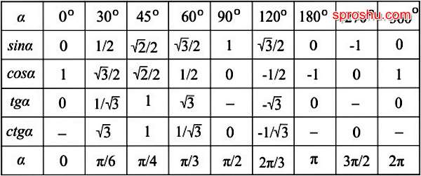 Находим слева sin, а сверху значение 270 градусов и видим на пересечении значение "-1".