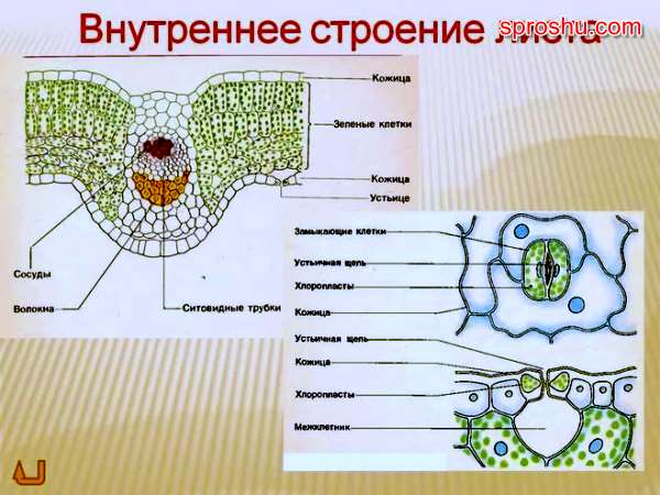 Кожица - один из видов покровной ткани. На ее поверхности есть обычные клетки с хлоропластами и парные замыкающие. В их цитоплазме тоже содержатся хлоропласты. Между этими замыкающими клетками есть щели. Эти клетки и сама щель образуют устьице. Через такие образования происходит газообмен и испарение воды. Обычно у растений устьица расположены на всей поверхности листа, но снизу их всегда больше. У водных растений все устьица расположены на верхней стороне листа, а на подводных листьях их совсем нет.