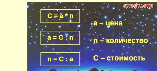 Если цену за одну единицу товара обозначить буквой «а», а количество обозначить буквой «n», то стоимость всего товара (а это обозначим буквой «с»), будет выглядеть так: