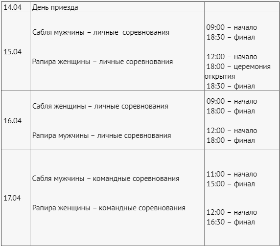 В течение семи дней до 21-ого апреля лучшие фехтовальщики страны померятся силами на фехтовальных дорожках. Чего стоят такие имена, как Инна Дериглазова, Софья Великая, Тимур Сафин, Яна Егорян, Вениамин Решетников и другие...