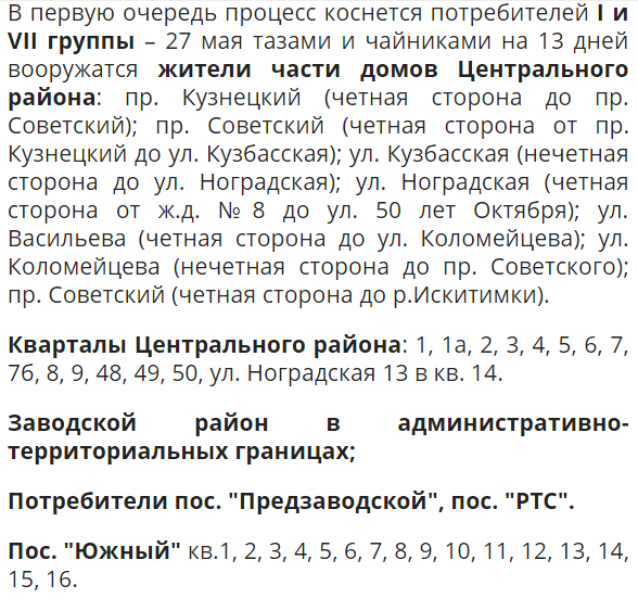 Четвертый, последний этап отключений горячего водоснабжения, будет проходить с 15 по 28 июля, и он будет касаться потребителей IV группы, проживающих в Центральном, Ленинском, Заводском, а также Кемеровском районах: