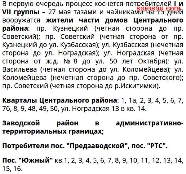 Первый этап отключений горячей воды в Кемерово стартует 27 мая 2019 года, а отключаться будут потребители, относящиеся к I и VII группам: