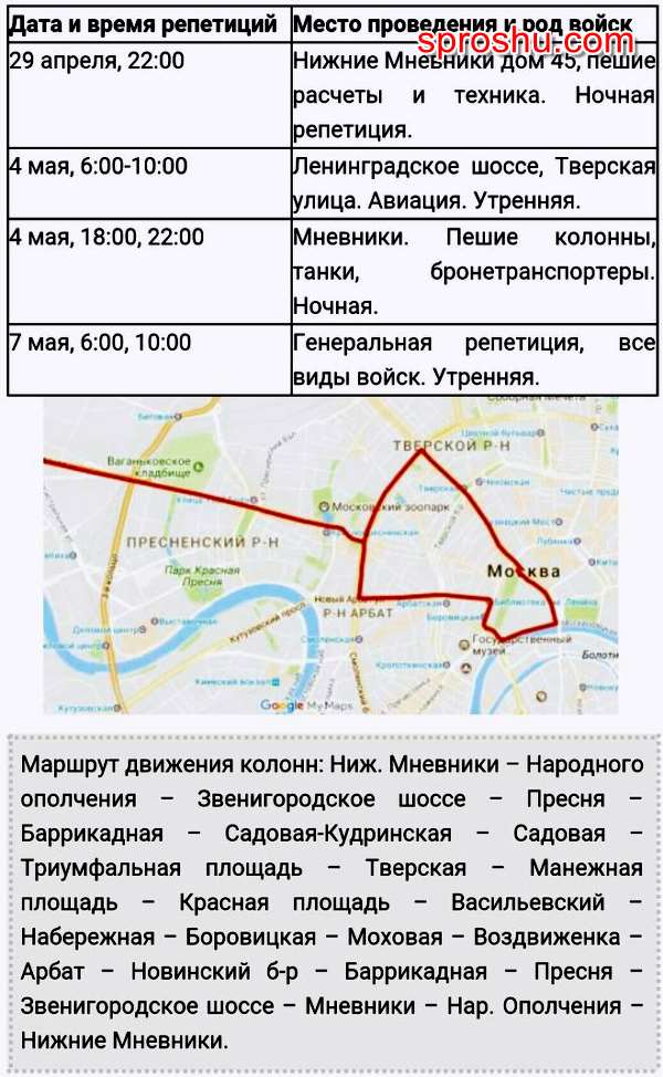 Парад Победы 2019 в Москве репетиция по какому маршруту, схема движения?