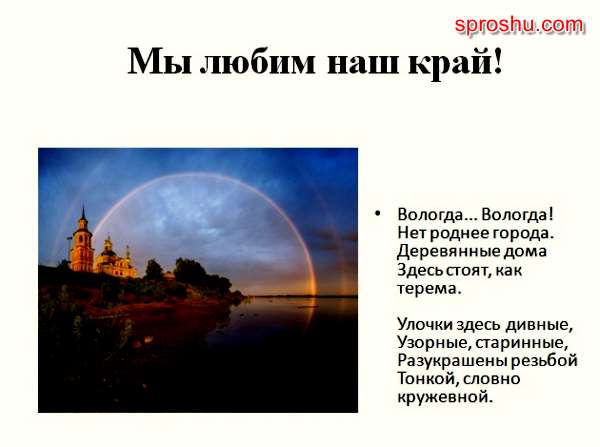 1) В нашем крае очень много лесов и рек, так же у нас очень много церквей, которые смотрятся красиво. В плакат можно вставить стихотворение о красоте края или о своем городе. Я вставила куплет из песни о своем городе.