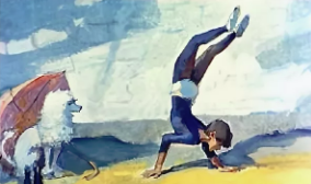 Можно нарисовать мальчика, выступающего с акробатическими номерами вместе с пуделем.