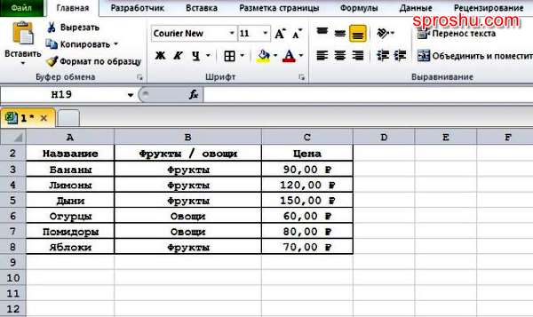 В нашем случае это столбец "Фрукты / овощи" (B).