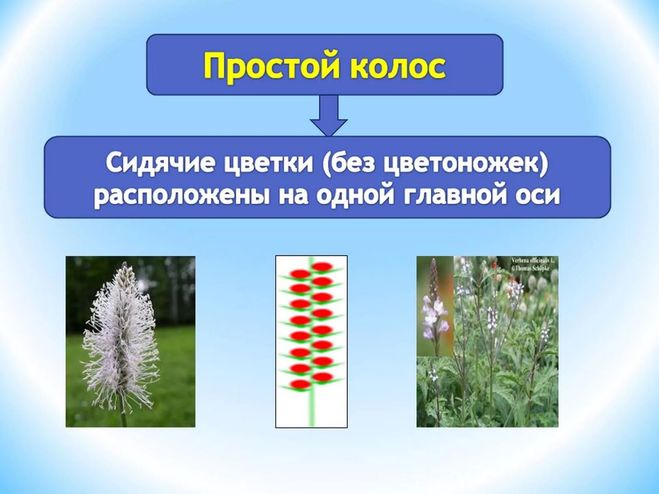 Простой колос образуют цветы не имеющие цветоножек - по другому их называют сидячие цветы. Примером может служить подорожник - цветки которого расположены на общей оси соцветия.