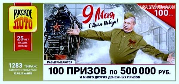 В 1283 тираже Русское лото розыгрыш пройдет до 86 хода и в мешке останется 4 бочонка. Хотя в честь 9 мая Гослото могло бы дать участникам фору, увеличить шансы выиграть денежные призы. Тем не менее, в праздничный 1283 тираж будет разыграно 100 призов по 500 тысяч рублей. Нужно лишь купить билет в котором числа выпадут раньше других.