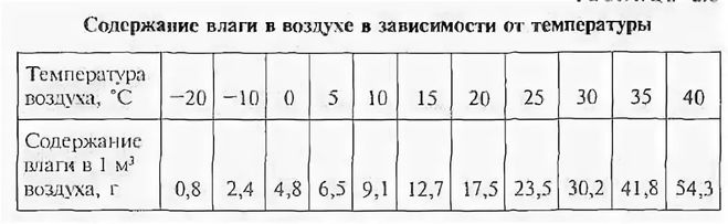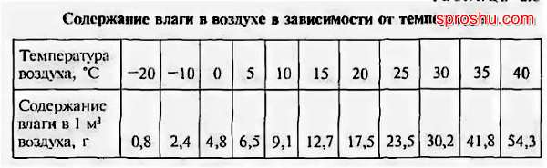 Из таблички видно, что при 25 градусах в кубометре воздуха 23 грамма влаги, в спальне площадью 10 м.кв. растворен почти литр воды. Это если вы варите, жарите, стираете, дышите а все окна и двери закрыты наглухо. Вот и высаживается влага на стекле или стенах там где они холодные.