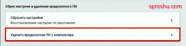 Прокручиваем вниз до надписи дополнительные и смело нажимаем на эту кнопку. Снова прокручиваем вниз и останавливаемся на надписи "Сброс настроек и удаление вредоносного ПО". Вот здесь то вы и увидите такую надпись "Удалить вредоносное ПО с компьютера". Снова жмёте на этот текст и запустится сканирование вашего компьютера на предмет вредоносных программ и различных вирусов.