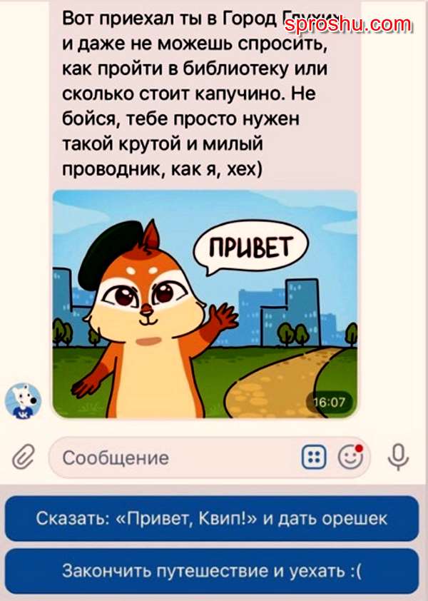 и затем бот группы пришлёт сообщение с приветствием от бурундука Квипа, который будет вашим проводником в городе, где живут глухие люди.