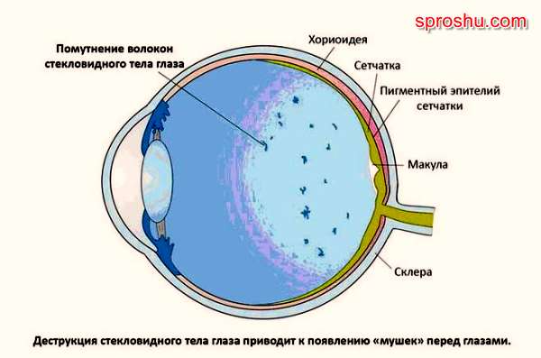 Стекловидное тело, которое занимает пространство между сетчаткой и хрусталиком – это прозрачное студенистое вещество – в норме должно быть прозрачно. При данном заболевании отдельные волокна стекловидного тела утолщаются и теряют прозрачность. Это и приводит к помутнению стекловидного тела и возникновению «мушек» и «ниточек», которые мешают беспрепятственно смотреть на окружающй мир.