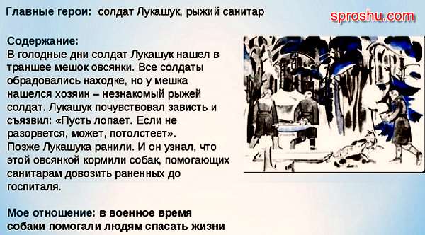 Когда его переложили на носилки, Лукашук увидел, что к санкам были привязаны три собаки. Заиндевевшие, они лежали в снегу, полузакрыв глаза. Санитар подошел к собакам с каской, полной овсянки. Тут-то и вспомнил Лукашук тощего солдата, забравшего мешок с овсянкой. Он пошутил, что тот так и не потолстел, хоть и слопал один целый мешок овсянки. Санитар, улыбнувшись, отозвался, что овсянку съели собаки. Благодаря этому и его благополучно доставили в госпиталь. И заверил Лукашука, что жить он будет.