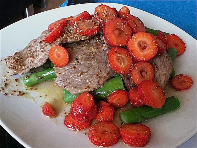 Можно потушить говядину вместе со спаржей, посолив, поперчив на сковородке. Когда говядина уже будет готова. Добавить к ней нарезанную кружками землянику. И потушить еще 1 минуту.