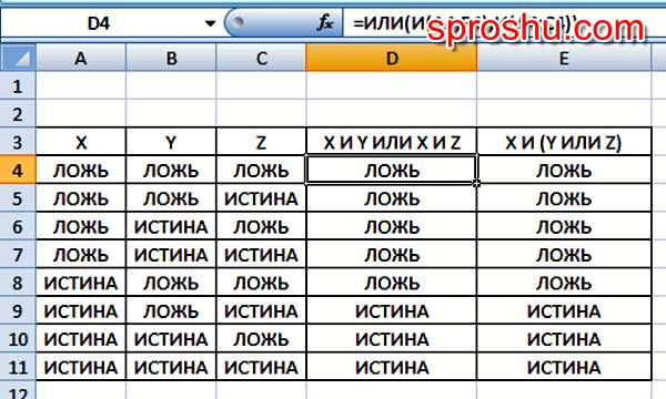 формула для строки 4 и выражения X И Y ИЛИ X И Z будет выглядеть так: