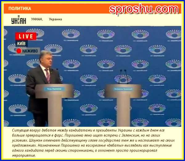 И почему Владимир Зеленский должен был отправляться на дебаты 14 апреля в 14:14, если его предложение было совсем другим - 19-й год, 19-е число, 19-ть часов? Разве он обещал быть на стадионе в это воскресенье? По-моему, никто не слыша, чтобы лидер предвыборной гонки на Украине давал такое обещание. То, что Пётр Порошенко сам туда явился - его проблемы. Сам себе назначил, сам исполнил.