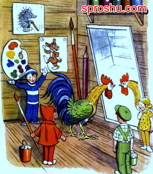 Петух. Мальчик забыл раскрасить петуха, и петух ходил нераскрашенный и несчастный. Когда краски его раскрасили, то он стал счастливым.