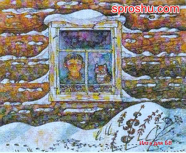 Тут изображен Витя, который болеет, рядом с ним кот. Нарисуем сначала передний план. Покажем, что действо происходит зимой, но из сугробов пробивается сухая травка. На заднем плане нарисуем часть бревенчатой избы и окно. Добавьте снега. В окне нарисуем Витю, а рядом с ним кота.