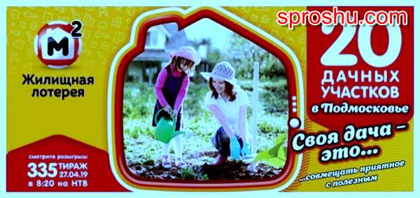 Утром 27.04.19 (суббота) состоится розыгрыш 335 тиража, включаем канал НТВ в 8:20 (время московское). Красочный лотерейный билет Жилищной лотереи 335 тираж оформлен в яркой красной и оранжевой гамме цветов, в центре изображена девочка с зеленой лейкой, а мама присела, чтобы уплотнить зеленые ростки, которые поливает дочь. Жилищная лотерея 335 тираж разыгрывает по 20 дачных участков в Подмосковье, а также ожидают приятные призы, пусть и не такие большие в денежном выражении, но которые будут не лишними.