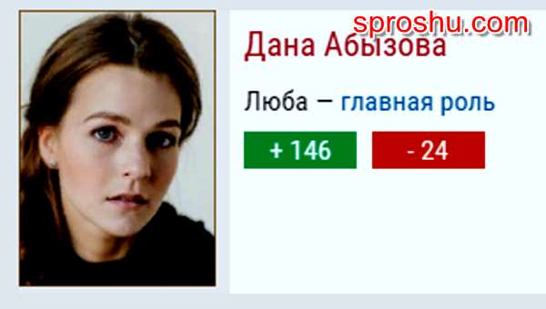 В украинской многосерийной мелодраме под названием "Испытание" главную роль Любы замечательно сыграла молодая российская артистка Дана Абызова. В настоящее время Дане Абызовой 30 лет. Она появилась на свет 12 мая 1989 года в одном из роддомов латвийской столицы Риге.