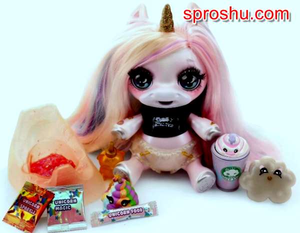 Своеобразная игрушка, неоднозначная. С одной стороны, симпатичная, даже милая, с красивыми глазами. С другой, внешний вид можно воспринять как слегка вульгарный, некоторые так и называют эту игрушку. Неоднозначные впечатления вызывает то, что игрушка ест ингредиенты слайма, а впоследствии (извиняюсь за подробности) ходит ими в туалет в свой горшок сквозь неоднозначное отверстие в самом откровенном месте. Как к этому относиться, думаю, каждый сам для себя решит, детям нравится, они забавляются и не вносят какой-то подтекст, который моментально виден взрослым. Цена игрушки около 7000 рублей. Распаковка игрушки напоминает распаковку куколок Лол, ребенок постепенно открывает обертку и находит небольшие сюрпризы, в конце находит самого единорога. Довольно полный видеобзор игрушки можно посмотреть по этой ссылке.