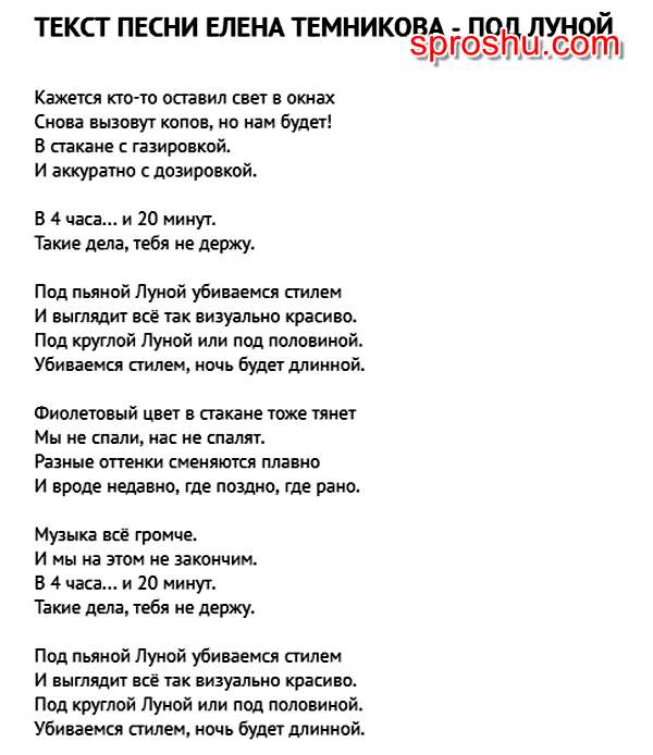 Песню "Под луной", в которой имеются слова "Под пьяной луной" исполняет певица Елена Темникова.