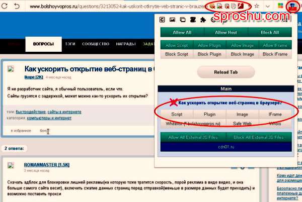 Зачастую, скорость открытия страницы зависит от "загруженности" открываемой страницы (реклама, флэш, изображения, скрипты). Тут мы практически бессильны, но справиться можно. И как ни удивительно, а на помощь может прийти дополнение для браузера, ограничивающее загрузку сайтов. Мне (для браузера на Chromium движке) приглянулся Script Defender.
