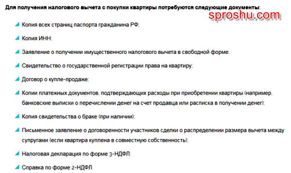 Для того, чтобы вернуть НДФЛ с покупки квартиры нужен следующий пакет документов: