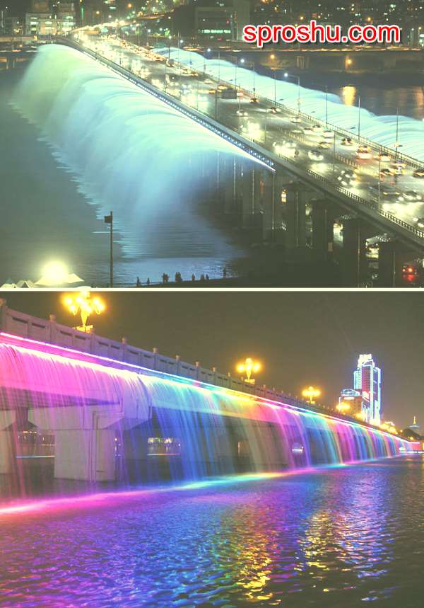 Самый длинный фонтан в мире находится в столице Кореи Сеуле. Это мост- фонтан, называется "мост Банпо". Но необыкновенная красота подсвеченных струй, завесой спадающих с моста в реку, дала ей еще одно название , которое больше нравится и местным, отдыхающим вблизи моста, и туристам - "Лунная радуга". Общая длина фонтана ( а струи ниспадают с обеих сторон моста)1140м. Огромное количество светильников позволяют не только подсвечивать струи, но и проводить целые световые шоу. Что уже заметно увеличило число туристов в Сеуле, а это и была задача властей города, и фонтан был одной из составляющих проекта.