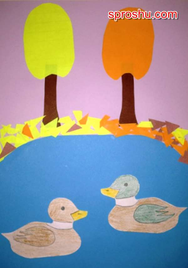 Для такой аппликации предварительно воспитатель готовит лист бумаги с нарисованным шаблоном утки и очертаниями пруда.