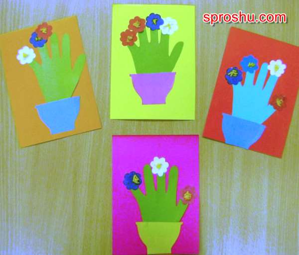 Отдельно вырезаем детали горшка, приклеиваем к горшку ладошку, а сверху украшаем цветами.