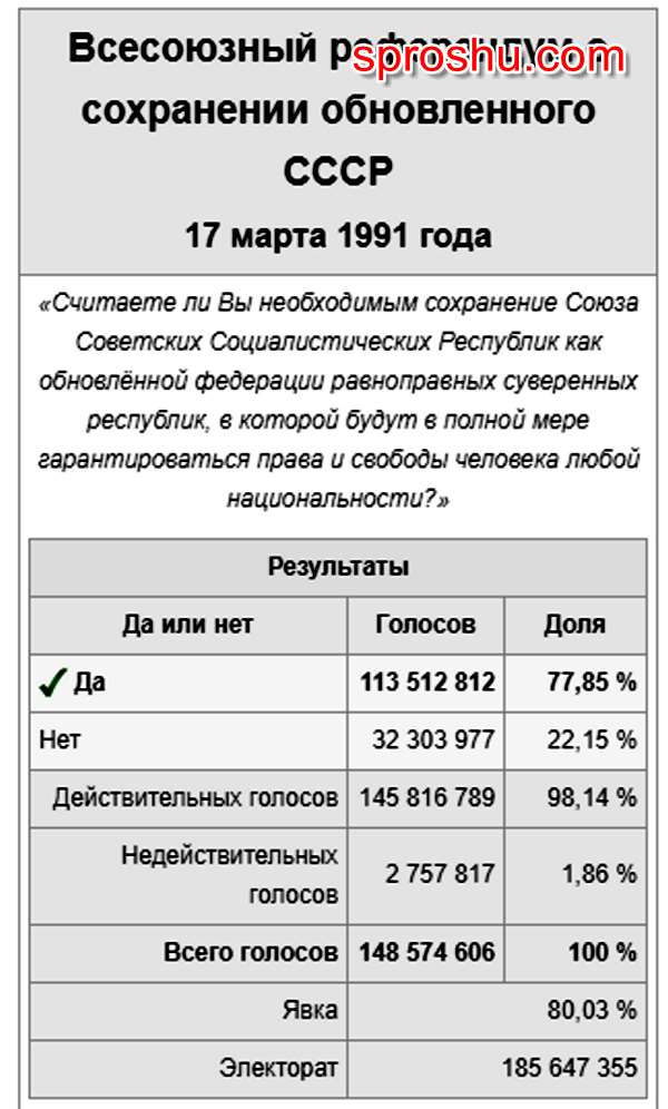 На этот вопрос 76,4% населения страны ответило положительно. Однако не прошло и года, как результаты референдума были проигнорированы и СССР прекратил свое существование.