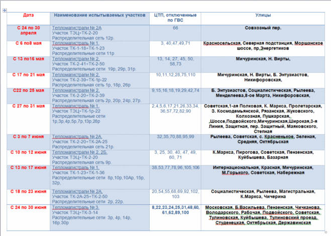 График отключения горячего водоснабжения в Тамбове в 2019 году представлен ниже.