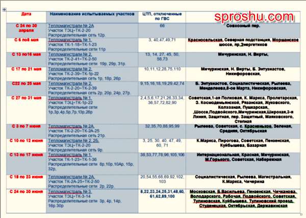 Гидравлические испытания проводятся в два этапа: выявление и устранение слабых участков тепломагистралей; проверка проведенных ремонтных работ. Отключения горячей воды потребителям проводятся по согласованному с Администрацией города графику, из которого видно, что плановые отключения ГВС были запланированы с 24 апреля по 30 июня 2019-го.