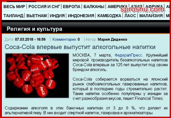 Я недавно читал, что в Японии выпускают газировку Coca-Cola вообще без красителей. То есть это прозрачная газировка, но со вкусом Coca-Cola. На сколько это правда не знаю. Сам там не был. Про алкогольный напиток этой фирмы впервые слышу. Не знаю как другим, но лично мне бы хотелось, чтобы подобная продукция никогда не добралась до России.