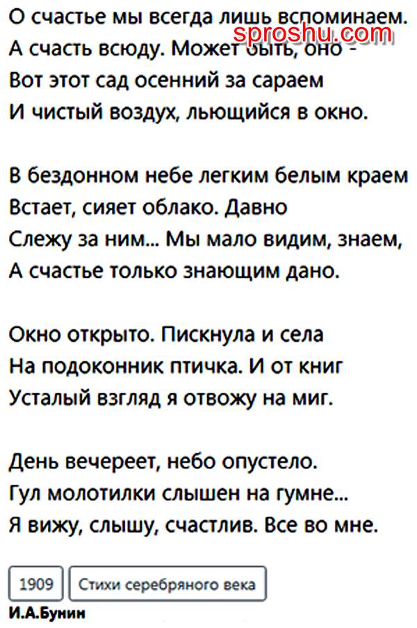 В нескольких четверостишиях столько выражения, столько прекрасного! Начинает автор с того, что рассуждает о счастье: о нем "мы всегда лишь вспоминаем" и добавляет, что счастья больше, чем человек может представить себе: "оно всюду", в самых обычных мелочах, как "осенний сад", прозрачный, "чистый воздух" и т. д.