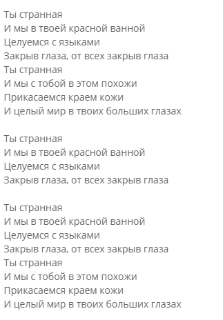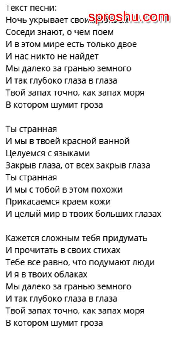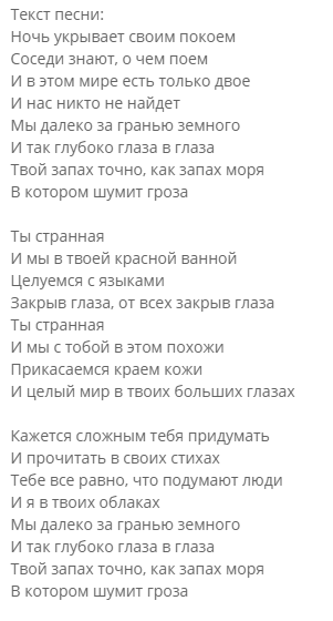 Замечательную песню под названием "Странная", в которой в припеве есть строчка "Ты странная" поёт украинскиё певец и композитор Макс Барских. При желании эту композицию можно скачать бесплатно и послушать онлайн на этом сервисе.
