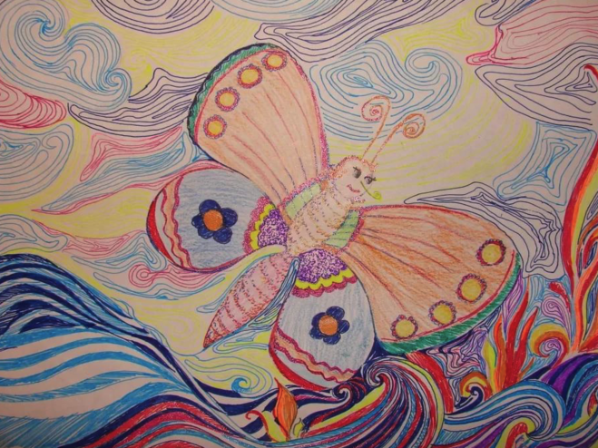 Среди ярких декораций изображаем красивую разноцветную бабочку, которая поражает своей красотой. Сначала рисуем тело, затем делаем наброски крыльев. Приступаем к прорисовке усиков, глаз. После этого украшаем бабочку как только угодно. А на фоне бабочки можно нарисовать еще много красивых узоров.