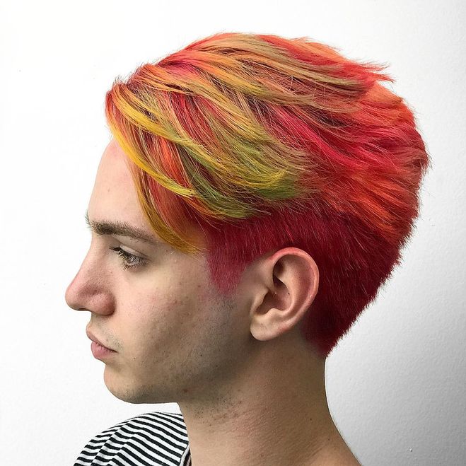Спортивный стиль - в таком варианте на затылочной и височной зоне длина прядей всего лишь 1 мм, на макушке и затылке до 3 мм. Креативно смотрится наличие прядей-перьев. оригинально и модно в этом году будет смотреться асимметричный вариант мужской стрижки с косой челкой.