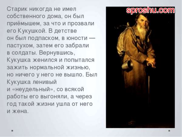 Он всё жизнь страдает, мается от одиночества, у него нет дома. Именно поэтому его и прозвали Кукушкой.