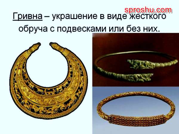 Гривны как украшения использовались еще в старые времена ,в 10 -12 веках.Находят и более ранние.Они представляют из себя как обручи или кольца разрезанные и одевались в основном на шею, так и назывались шейные гривны. В те времена изготовлялись из разных материалов,в зависимости от финансового состояния человека.Были и бронзовые и медные,но в основном конечно серебряные и золотые.Золотые могли позволить себе лишь очень состоятельные люди тех времен. Сейчас тоже в моде ,но делаются из более разнообразных материалов.