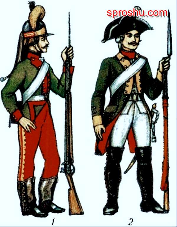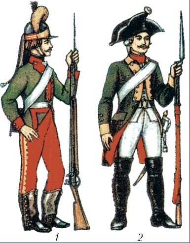 Мушкетёры российской армии: 1 – сержант; 2 – рядовой (2-я пол. 18 в.).