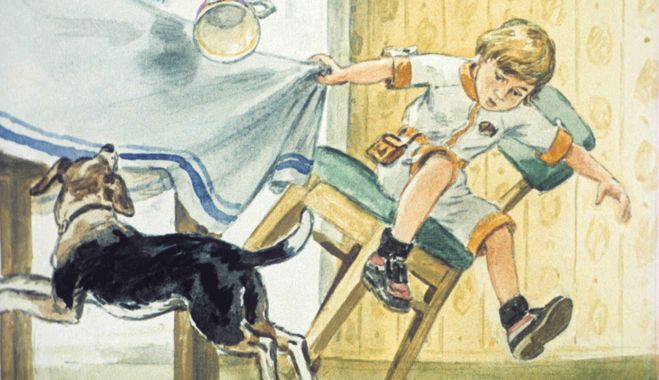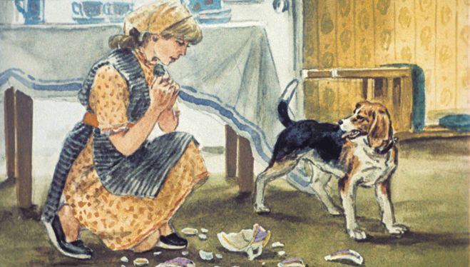 Главный герой рассказа сидя за столом, раскачался на стуле и чуть не упал. Он хватается за скатерть и тогда со стола на пол летит посуда, а папина чашка разбивается. Мальчик испугался, что мама его будет ругать и поэтому, свою вину сваливает на пса.