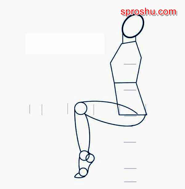 Сначала нужно нарисовать общие очертания, ноги рисуем под углом 90 градусов.