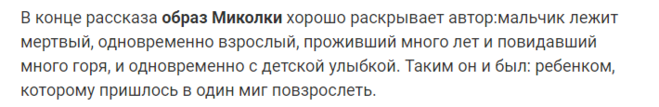Так же мальчика-подростка можно назвать и наблюдательным. Миколка любит своих родных. Его младшую сестренку с ним в лес не пустили и он ей нарвал цветов, которые спрятал запазуху чтобы девочке сделать сюрприз (для БВ). Миколка очень любит своих родных. Когда он узнал, что мама и сестра погибли он растерялся и не знал что делать, даже пошел к старику за советом. Миколка не плачет на людях, волю слезам дал только когда спрятался.