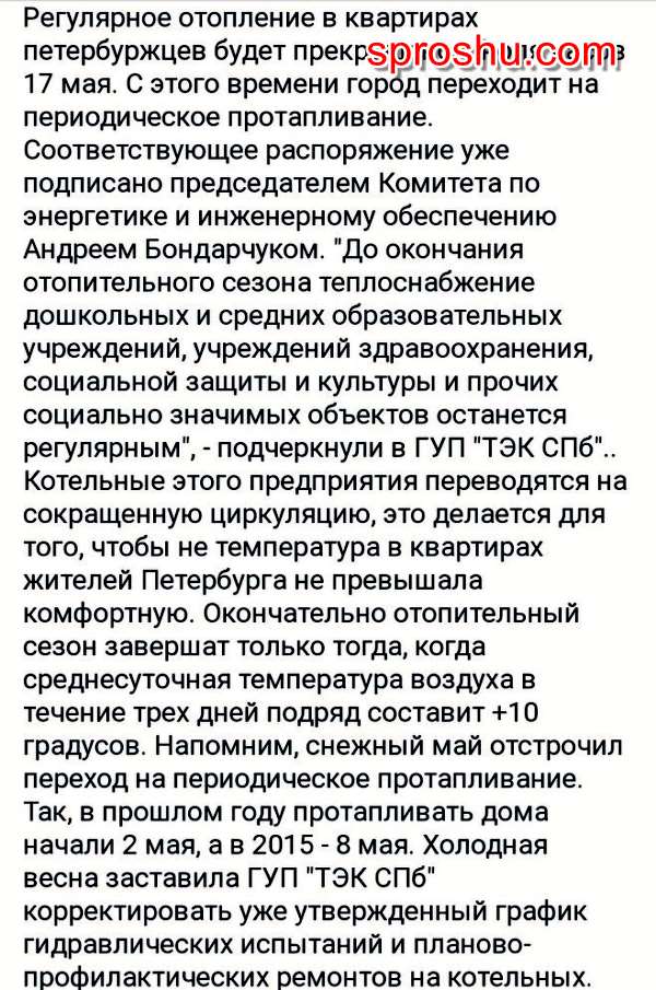 Учитывая, что в прошлом году, отопительный сезон в Санкт-Петербурге закончили 10 мая, стоит ожидать, что и в этом году, примерно к этим числам полностью прекратят подавать тепло в квартиры.