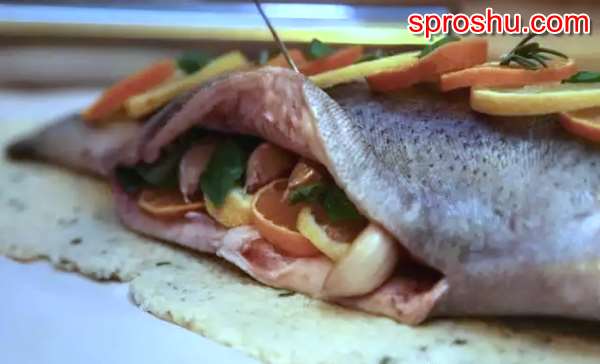 Для приготовления потребуются примерно 1 килограмм форели или горбуши, один лимон, два мандарина, три дольки чеснока, помидорки черри. Для солёного теста потребуются 330 граммов крупной соли, 420 граммов муки, 3 сырых куриных яйца, 160 миллилитров воды, две ветки розмарина.