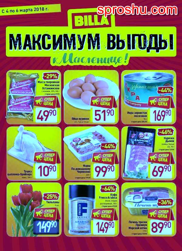 С 4 по 6 марта 2019 года супермаркеты "Билла" предлагают максимум выгоды при покупке продуктов к Масленице.