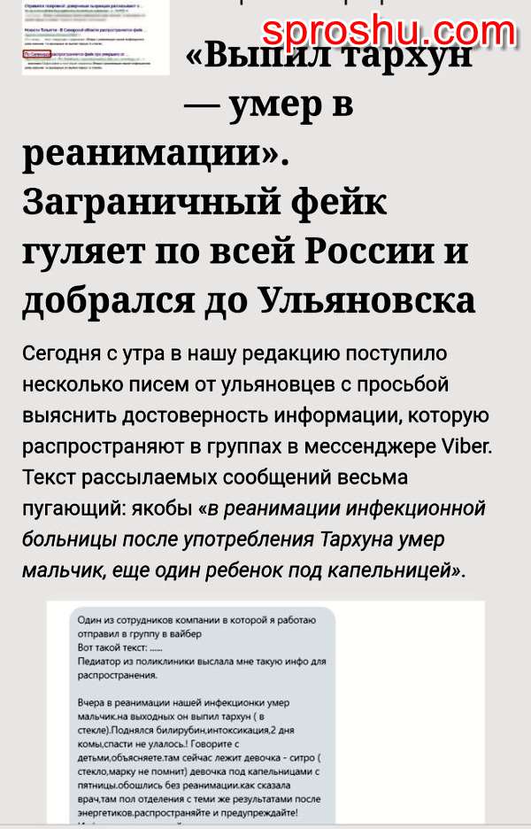 Поражаюсь я мамочкам, которые не проверив информацию, кидают её всем знакомым по вайберу и во всевозможные группы общений. Получив такое сообщение я первым делом, не поленилась и проверила в интернете. Ведь не так давно подобный фейк запустили в момент трагедии в "Зимней вишне", что на самом деле там не 60 погибших, а 500. И вот что удалось выяснить про тархун.